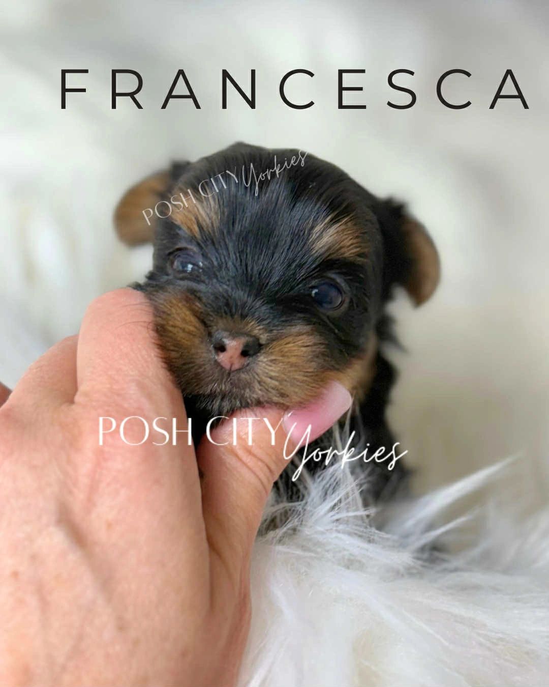 If you’re drawn to Francesca, it means you have truly exquisite taste. She’s ready to be the perfect companion, bringing joy and sophistication to her forever home.We are dedicated to breeding high-quality Posh City Yorkiess for loving homes. Our Posh City Yorkiess are raised in a family environment and receive the best care and attention. We take pride in producing healthy, happy, and well-socialized Posh City Yorkiess that make excellent companions. Browse our website to learn more about our breeding program and available puppies.